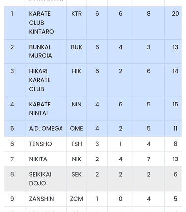 La Liga Regional de la Federación de Karate de la Región de Murcia se ha consolidado como un referente para los clubes autonómicos . Durante cada jornada, los equipos compiten no solo por los puntos, sino también por un lugar destacado en el ranking, que refleja su desempeño a lo largo de la temporada. En esta entrega, analizaremos los resultados del Karate Club Kintaro y del ranking de clubes autonómico tras la segunda jornada de la liga, con un enfoque en los resultados más relevantes y las proyecciones futuras.